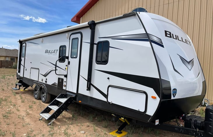 This brand new 2022 29 foot Bullet sleeps 6 comfortably and is rated for up to 10 people.