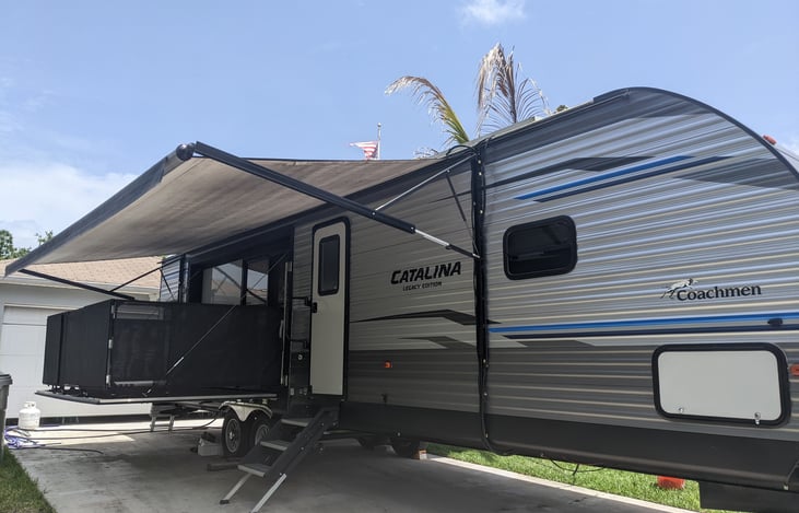 Fully off-grid solar 34 foot Coachman Catalina Legacy edition. Bumper pull travel trailer with the anti-sway kit, 50amp connection, 2 air conditioners, outdoor floating porch with sliding glass doors. Very comfortable pillow top full queen mattress, which was purchased to replace the crappy mattress that came with the RV.