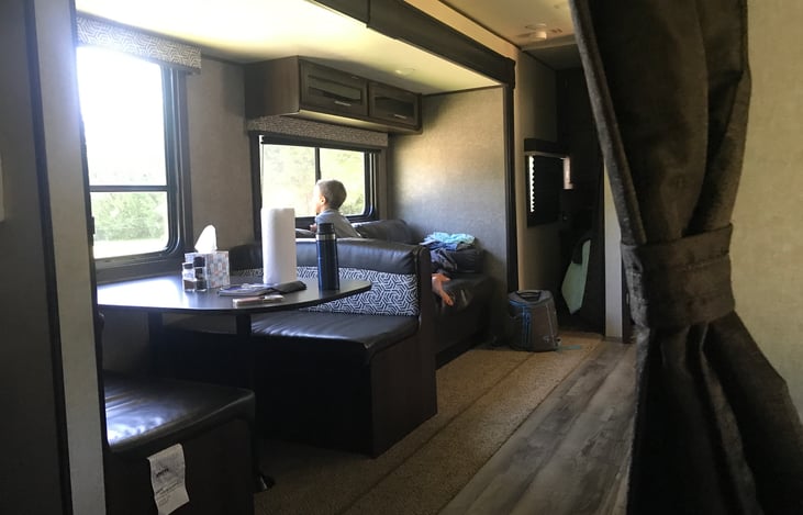 Very spacious pet free, smoke free camper that sleeps 8. It has a slide-out with a kitchen table and sleeper couch. It has an outdoor shower and WIFI retriever. We provide cups, plates, bowls, utensils, pot and pan, coffee maker and filters, coffee cups, microwave, blanket and pillows in master bedroom only, so please bring extra if needed. We do not provide towels.