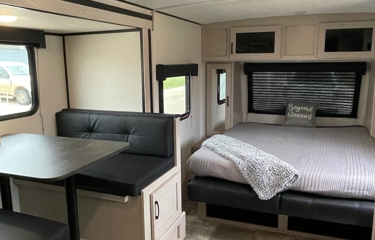 Fully stocked with linens, kitchen dinnerware, cooking essentials, a keurig and air fryer, indoor and outdoor kitchen as well indoor and outdoor showers! Whether you are looking at camping with hookups or boondock camping, this Off Grid RV offers the ability to go where you want to go!