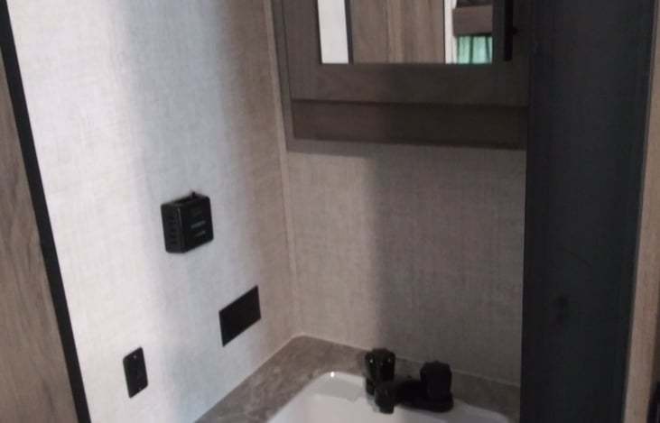This rv is brand new. It has a microwave and a stove. The shower is nice and big with hot water. Very spacious and homie. It has USB port for you electronic devices.