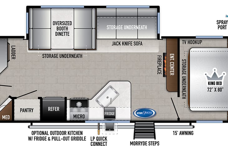 This beautiful RV has everything you need to have an amazing trip! Sleeps 8, King size bed in own room, bunk beds and pull out couch. Bathroom with a privacy door. One massive slide out, a gas fire place inside and a 15' awning. Open concept floor plan L shaped kitchen with a big sink 3 burner stove and a big food pantry.