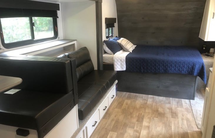 Ideal as weekend getaway for a couple or a family with small children. Full queen bed. The slide out has a couch and a dining room table that can both be converted. Solar power. USB ports. Awning with the LED lights. Fully stocked for the perfect getaway, including; outdoor rug, outdoor grill, kitchen plates, utensils, cookware, linens, cards, floaties, etc....