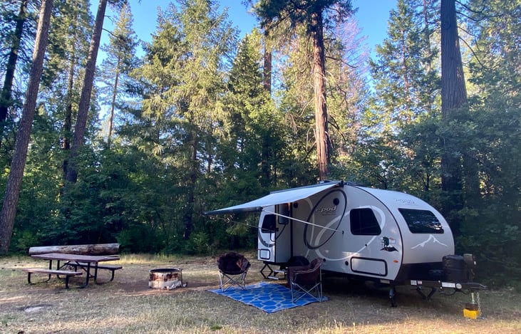 For a quick weekend getaway or a month long vacation, this is the travel trailer for you! By the beach, at Lake Tahoe, among the redwood trees, or in the Sierra mountains, “Pork Chop II” has everything you need for a great camping adventure. She comes fully stocked with bed and bath linens, kitchen essentials (dishes, glasses, silverware, pans), Keurig, outdoor chairs, and an option for delivery!
