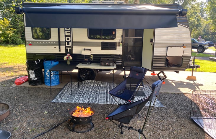 Hi there, we are Ryan and Kaela and we have been happily married for 3 years. We are accompanied by 2 fur babies, Penny the Pitbull and our sweet baby Nora who is a chihuahua terrier mix. From the beginning of our relationship we have always enjoyed going camping together. We started out in a tent and have worked our way up to this beautiful trailer and now we want to share in the memory making!