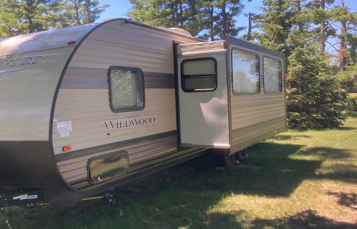 Camper has an outdoor kitchen with a mini fridge. Has DVD player and tv in the living area. Speakers and led light for the outside. Linen included. Camper has a super slide. With a couch and table. The camper sleeps 11 if needed.