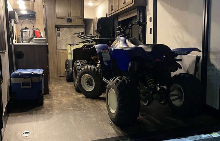 30 gallon fuel tank, with pump to gas up toys, or another vehicle. Microwave, stove, heater/ac, retractable awning, outdoor speaker system (bluetooth stereo), full bath, lots of storage space, camera links to phone, generator, fits up to 3 quads