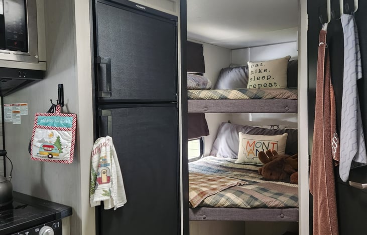 This camper offers a queen size bed with privacy doors, bunk beds, and the u-shaped dinette turns into a double bed. The kitchen is fully stocked. Complete with towels, linens, and extra blankets. Also has an outdoor kitchen with a cook top and fridge.