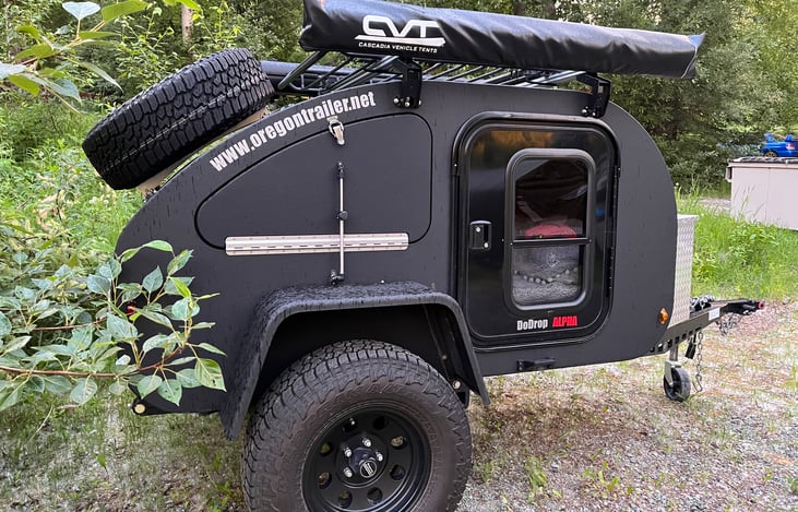 Off-road Oregon Trail’r for rent. Small, Lightweight and easy to tow. Approx 550lb, with off-road hitch, tires and suspension. This trailer takes your off-road camping experience to the next level. It is super cozy inside, sleeps 2 adults comfortably. Sun heated pressure tank on the roof with a fold-out shower, roll-out awning, roof rack for your gear, and memory foam mattress inside.
