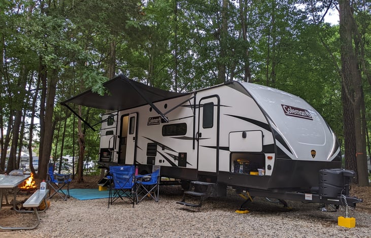 This exclusive capacity brand new 2021 Coleman bunkhouse has all the amenities you will need for a fantastic getaway. Enjoy all that the Carolinas have to explore any time of the year. Our camper is equipped with AC, an electric fireplace for heating, and a gas furnace. A separate entertainment center with a sofa along with a dining table area.