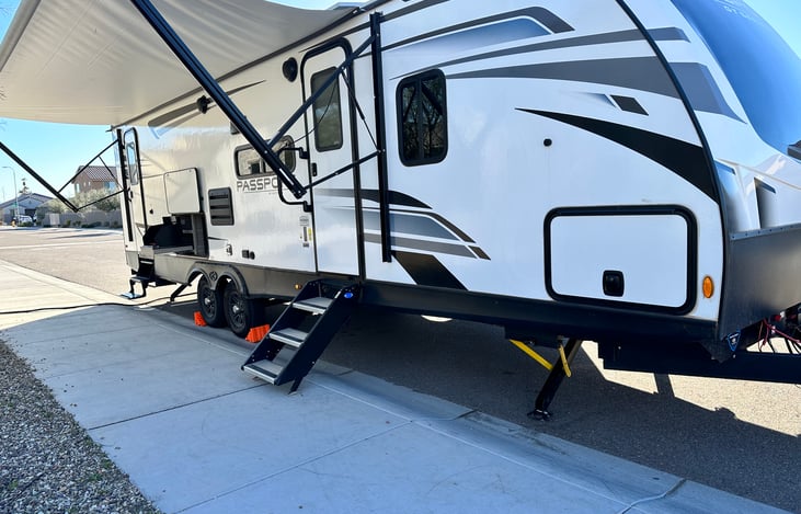 Enjoy our 2022 Passport GT. We searched high and low for the unit that would be a great fit for any family or group of friends to take anywhere. Sleek modern design. New WIFI system. New upgraded bed. Full pass through storage in the front. Electric jack on the front. Weight distribution and sway bar hitch help it move down the road so smooth. Fully stocked kitchen. This trailer has it all.