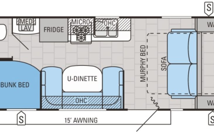 Roll, Jenny Jenkins, Roll! This little unit has the great convenience of a larger living room. No slide means less towing weight. Jenny is equipped with tow double bunks, a U-shaped dinette that converts to a super large bed, and a drop-down murphy bed. When the bed is up – you have a sofa (that will jack-knife) with an extra-large living room. Jenny comes with her own WDH, too.