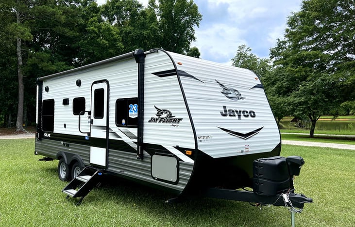 this is a new 2022 Jayco jay flight is a great couples RV! light enough to tow on most mid size trucks but big enough to feel comfortable. this rig is your home away from home! it has outside speakers and led lights in the awning and above the main bed. The dinner table and couch both convert into beds! it has great storage space under the main bed and kitchen space to store your spices!!
