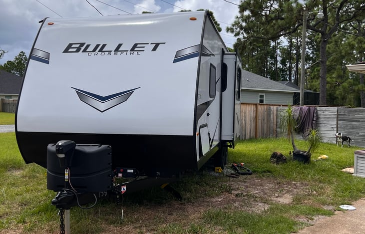 New 28ft RV with queen bed, bunk beds, and a table that folds into a bed. Propane powered stove and oven. Outdoor lights under awning. Ready for your great adventure. Bring paper plates and utensils. Will have basic cookware and toilet paper must use toilet paper that is provided. Linens not included.
