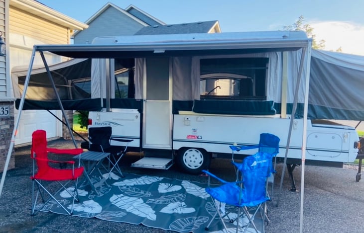 Spacious 19 ft Popup Camper with three slides. Two king beds and one full (dinette conversion). Stocked kitchenette with cutlery, plates, cups, bowls, toaster, and coffee maker. Choose to use propane furnace or electric heater. Portable AC unit provided as well.
