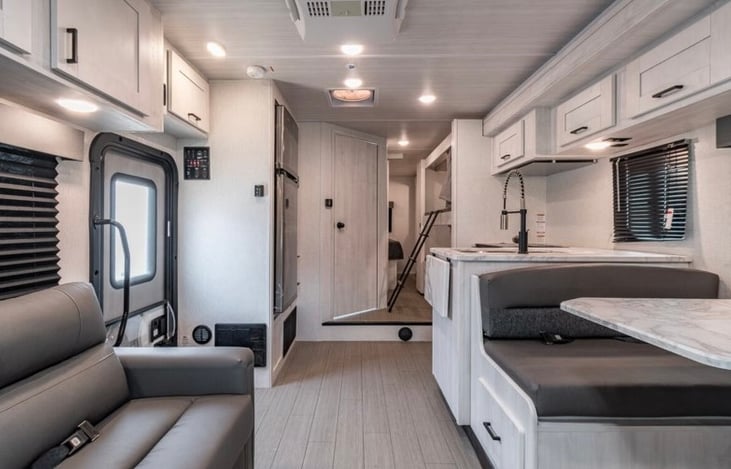 This bunkhouse is gorgeous and perfect for groups or families that want the most space a class C can offer. We provide an orientation at pick up to familiarize you with all the RV systems and ensure everything is working before you disembark. Inquire with us about additional savings for rentals of 7 nights or more.