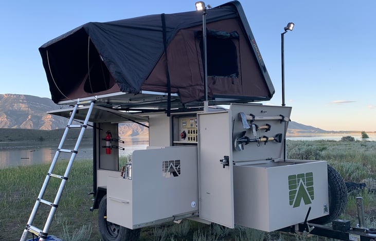 Off-road, off-grid trailer fitted out with all amenities and then some! This trailer is solid but lightweight, an easy pull for any suv. Sleeping quarters are in spacious 4-person rooftop tent by iKamp with built in mattress. Trailer offers excellent lockable gear storage with access on all three sides for convenience.