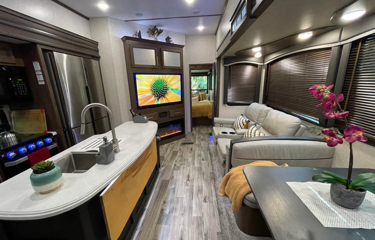 NOTE: No Disney deliveries until further notice due to their new RV delivery policies. If you have the capability of driving in the RV with your own truck, we could make an exception. From outside this luxury 5th wheel, it’s hard to imagine the one-of-a-kind floor plan that awaits you inside.
