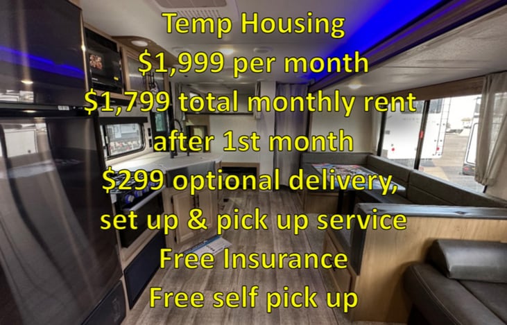 Temp Housing. $1,999 per month. $1,799 total monthly rent after the 1st month. $299 optional delivery, set up & pick up service. Free Insurance. Free self pick up.