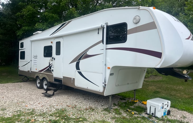 30 foot bunkhouse. Older, but in great shape. All bunks contained to one room in the back, queen sleeper in the front. Bathroom, with shower. Nice dining table, and couch that folds to a sleeper. New manual awning. 1 slide out.