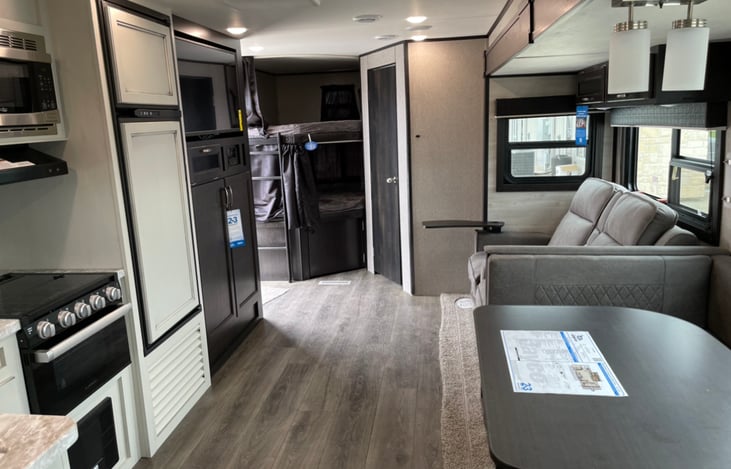Modern RV with all the amenities! Dual bunk beds, queen bedroom, kitchen, living room, and bathroom with toilet and shower! Awning with Bluetooth speakers!