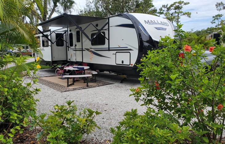 RV is parked at the East TOHO Campground, 10 mins from MCO Airport, all hook ups Ready, Electric 50Amps, Water, Sewer, Patio, Swimming pool, Boat dock, Air boat rides & Alligator sightseeing, very clean and spacious Campsite, turtles' lake, multiple Fishing Spots.
