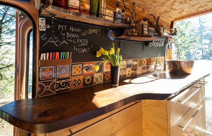Our EcoSprinter is unique! Live-edge walnut countertop? Check! Aromatic cedar paneling over wool insulation? Check! Cork flooring? Check! Solar-panels, Li-Ion battery (200 AH) with 12V and shore power? Check! Rent this great vehicle for these and so many more “pride of ownership” details.