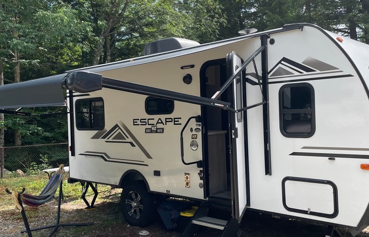Coast2CoastCamper Pet Approved Camper Rental-The Hatch is a brand new 22' ultra light travel trailer with a smidge of toy hauler mixed in. It has everything you need to enjoy your next vacation. With a 100-watt solar panel, this trailer thrives in the summer sun.