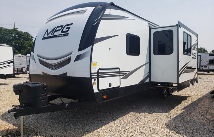 Brand new, spacious, modern camper with separate bedroom featuring a KING-sized bed! Also offers a set of full bunks as well as a comfortable U-shaped dinette that quickly converts to an additional bed. Our camper comes equipped with a coffee maker and all the basics for cooking and eating. There is plenty of storage space inside and out for all your gear.