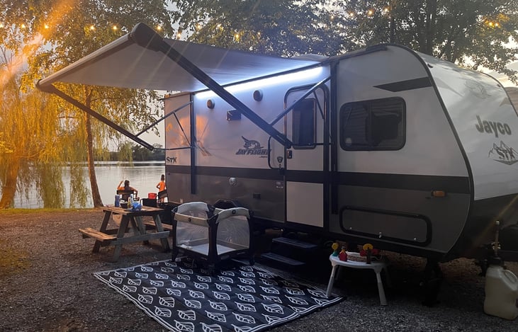 Brand new, extremely well kept. We use it for weekend lake trips (2 adults, 2 kids, no pets.) Upgraded memory foam queen mattress, 2 bunk beds and the dinette converts to a bed. Privacy windows with blackout curtains.