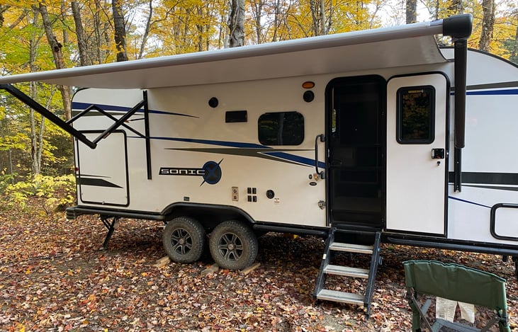 Our 2021 Sonic X is a 4 season off-grid ready camper ideal for hunting and fishing remote areas in Maine. It's equipped with solar panels, lithium battery, water filtration, and off road tires. The refrigerator and water heater run on both propane and electric. For the warmer days, the AC unit will take the edge off, and for colder weather, the furnace will keep the camper nice and warm.
