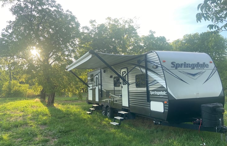Our 2018 Keystone Springdale is perfect for you and your families next adventure! This 35ft trailer with two slide outs will come completely furnished with an interior television, silverware, coffee pot, cookware, camp chairs. It also has an outdoor kitchen prep area on the exterior of the trailer.