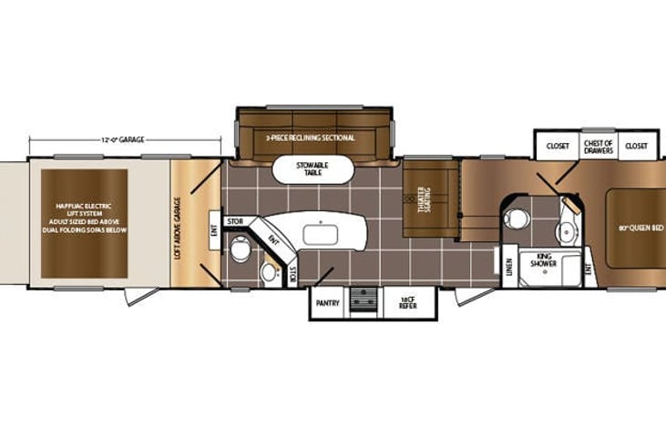 Clean and well taken care of 2017 toy hauler 5th wheel. Featuring 12' garage that can accommodate razor or other type ATV, also fully electronic bunk beds and queen bed with 2 bathrooms!, 3- tvs (large screen in living area) and VCR with sound system inside and outside speakers. Spacious kitchen with island.