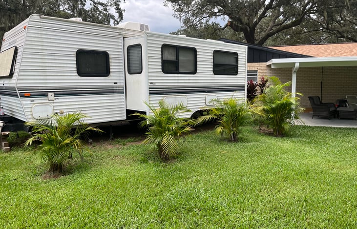 This 26' RV has a very comfortable queen size bed, large pullout with Couch and Dining room area. Large Double Kitchen sink with large refrigerator. All plumbing has is new. It sits at an angle in our backyard to allow the trailer to have it own private yard with a large brick paver patio. It includes it own private entrance and private covered parking area.