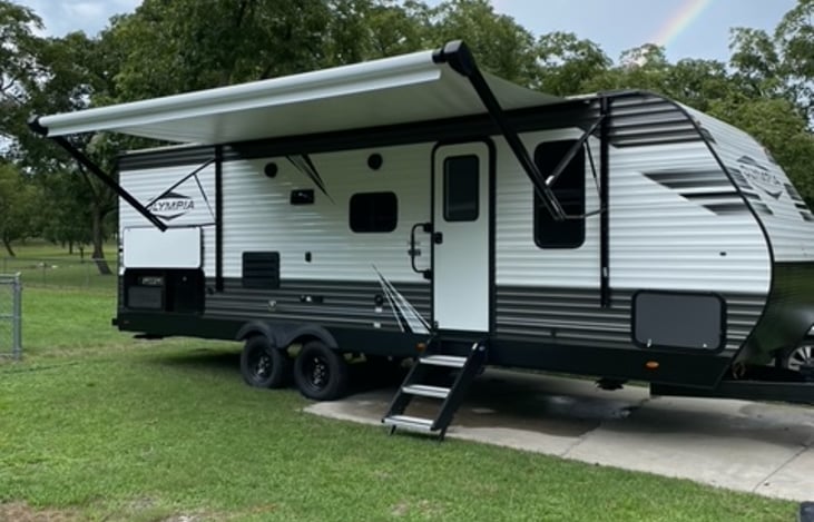 2022 Olympia RV (50 amp) with all the essentials to have fun and make memories with your family and friends. It is equipped with a queen master, bunk beds, pull out sofa and a dinette conversion. It includes linens, towels, kitchen necessities, an outdoor gas griddle and fridge, along with an outdoor rug, table and chairs. Camper has an indoor/outdoor audio system as well as an outdoor shower.