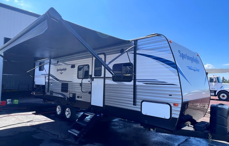 Welcome to our 2020 Keystone Springdale bunk house. Very spacious room for 6; 4 bunks in back room with privacy door, front RV queen master with privacy door all wrapped with comfy clean bedding. Couch pulls out to a double. Large living/dining room slide out. Under the large front awning you can set up 4 chairs 2 adult 2 child table bbq and corn hole game that is provided.