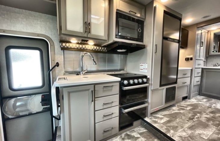 Try out our brand new family friendly (or couples retreat) RV! It's quoted to sleep 6, but 5 would be more comfortable. With the modern appliances and décor, it feels like home away from home. The roomy bathroom has a nice size shower and a linen closet with drawers. The drop down queen size "murphy" bed folds up during the day and clears up all that extra space to move around the RV more freely.