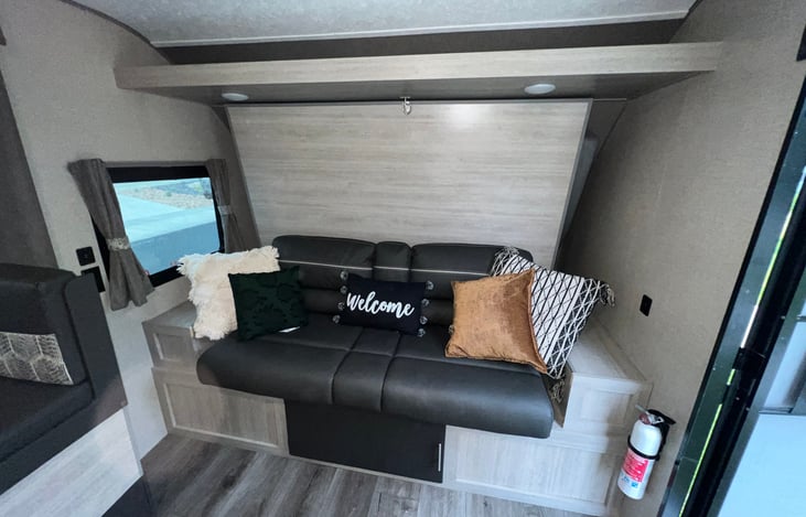 This RV is has the perfect setup. The queen size Murphy bed gives you plenty of room to sleep during the night, and folds up to a super comfy couch to give you extra space during the day.