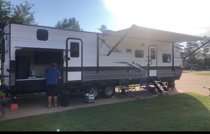 We have a brand new 2022 Jayco Jay Flight SLX 324BDS. Our camper is fully equipped with a private bedroom that has a queen-sized bed w/ an upgraded mattress & mattress cover. The bedroom as a 32" Roku smart TV.