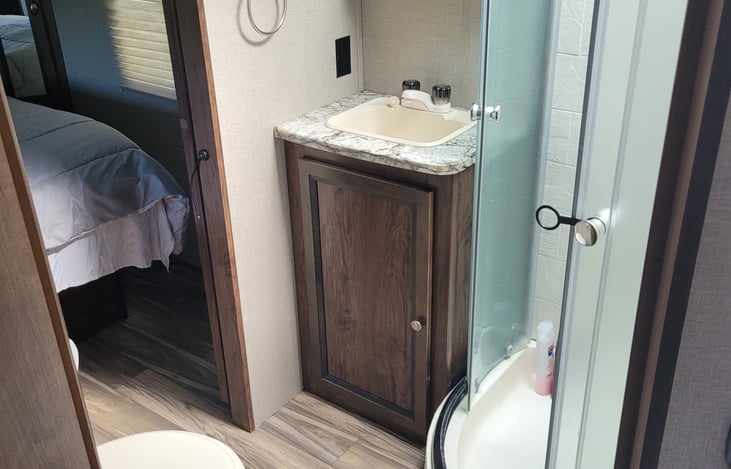 Front queen bed with full size bed bunkhouse. Super slide kitchen table and couch also refrigerator stove slide out. Corner stand up shower. Linens, towels and wash clothes included for up to 6 people. All pot, pans and silverware are stocked. Outside kitchen with refrigerator, sink and cook top. Also includes hotdog forks, pudgy pie maker