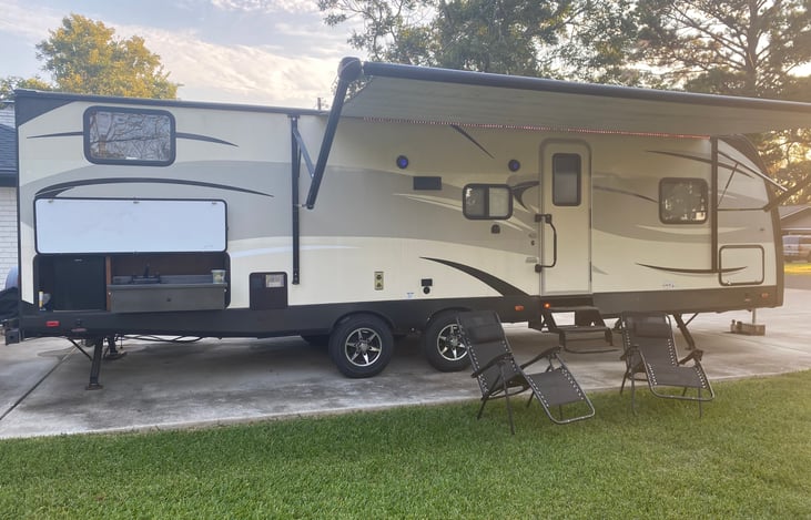 Bring on the outdoor adventures! This super clean RV has 2 roomy bunks for the kids and a private bedroom with pillow top mattress for the grownups. It will sleep up to 8 people. Includes an outdoor kitchen and shower - great for a luxury camping experience! Remote control awning, stabilizers and slide out for easy setup. You’ll love the inclusions - snacks, linens & paper goods.