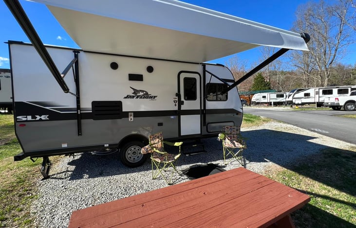 Lil Jake is a 2022 Jayco Jay Flight - Ready to give you big memories in the North GA mountains. This tiny tow is perfect for state parks and fits right in. It is perfect for a small 4 person family that wants to get out and camp but wants a few of the modern comforts on those hot summer days or cooler weather temps. This is a popular unit for Black Rock Mountain State Park, and Tallulah Gorge.
