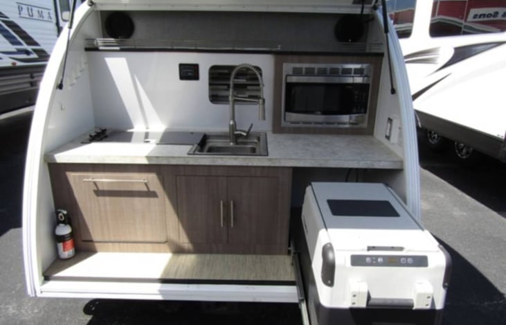 Bourbon Betty is an excellent teardrop. My wife and I took it to In the Pines for a couple of nights. It was super spacious in the cabin and very comfortable. The AC, fan, and protection from the rain was impeccable. The fridge, microwave, sink, and provided utensils were all in working order and provided us with some amazing meals.