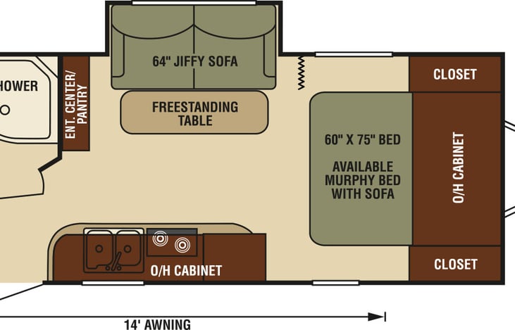 As you enter to the left there is a refrigerator. To the right of the entrance you will find a double kitchen sink, two burner range, and overhead cabinets. On the opposite side of the trailer there is a jiffy sofa slide. Next to the slide you can enjoy the entertainment center/pantry.