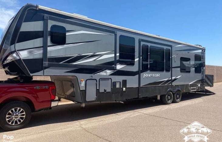 For an indulgent outdoor getaway, you need this Raptor toy hauler! This model includes all of your favorite RV amenities, and then some!