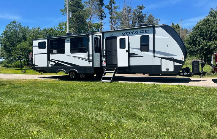 This is a luxury camper. A 2021 Winnebago voyage. This camper can sleep 7 comfortably. It has a king size master bed, a full size pull out bed, 2 twin bunk beds and the table folds Down to a bed. The full kitchen features a pantry, stove, sink and a nice size refrigerator and freezer. There is a couch with double recliners. There is a tv with cable hookup and a fireplace that keeps the place warm.