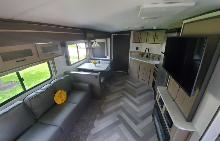 Delivered to your destination this luxury RV is perfect for your Glamping adventures. Beautiful inside and out, brand new, and plenty of room with one large slide out. This unit is perfect for a couple or small family. The master suite is a private room that sits in the front of the RV and offers a residential king mattress and it’s own AC unit.