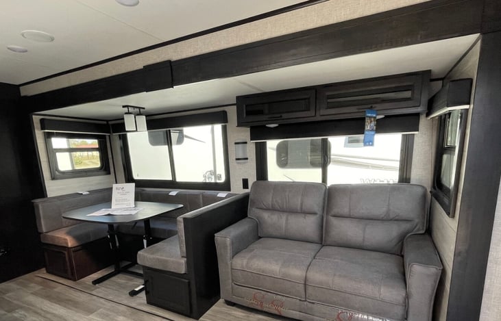 Perfect family home away from home. You have two bunks and a pull out queen in the back ( tv included ). Door closes to separate room from trailer. Big dining/kitchen area for entertainment. Pullout couch and dinning area pull out to queen beds. The main room is perfect for a good nights rest with swivel tv/mirror to kitchen. The bath is easy for little kids.