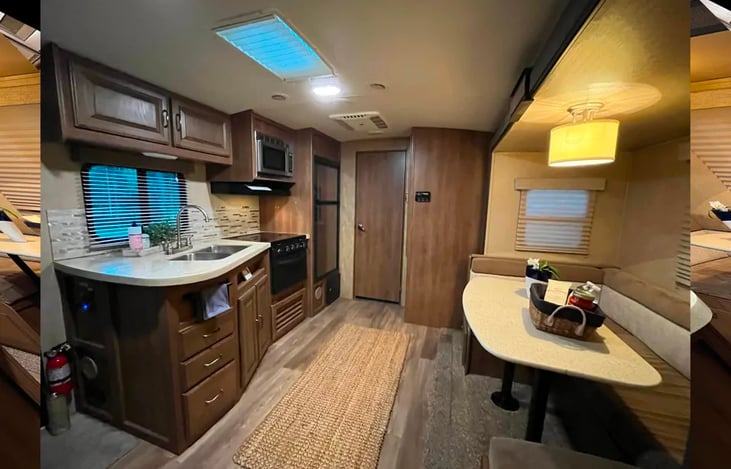 Experience the perfect blend of comfort and adventure with our well-appointed RV. If you're seeking an economical way to travel without sacrificing the comforts of home, our travel trailer is the ideal choice. Despite its compact size, it boasts a spacious and well-designed interior, complete with upscale finishes that enhance your travel experience.