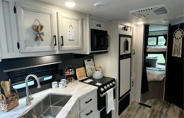 Beautiful 2022 Open Range 26 BHS professionally designed in BOHO Style to help you enjoy your trip and feel at home. It comes fully stocked with highest quality linens, pillows, towels, dishes, pots, pans, and utensils. Coffee maker with filters, cooking spices, 4 camp chairs and a table for outdoor seating, toilet paper, paper towels, smart TV, A/C and heat are also included.